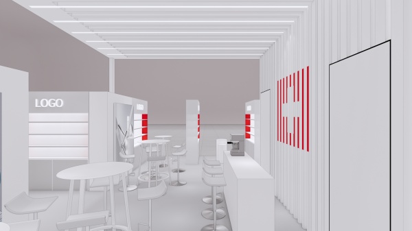一個采用垂直板條以及白色和紅色點綴的現代展覽設計,以體現瑞士的國家特色。
